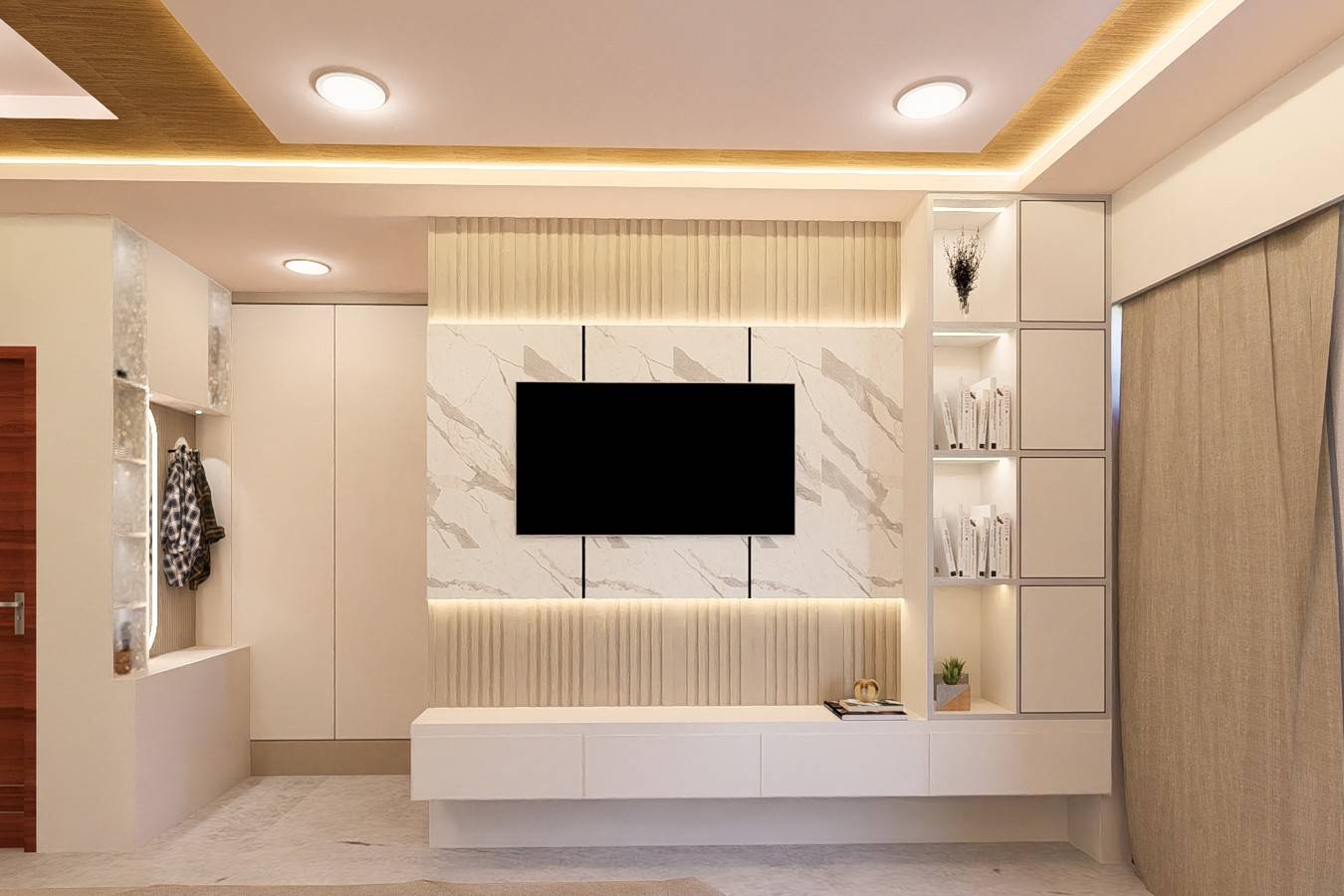 This modern living space blends clean lines with rich textures. Sculpted walls with teal accents add rhythm, while sleek lighting and marble finishes bring quiet luxury.